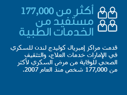 منذ عام 2007، تلقى الآلاف من الأشخاص خدمات العلاج، ونصائح الوقاية من المرض، والتثقيف الصحي في مركزي إمبريال كوليدج لندن للسكري في الإمارات العربية المتحدة.شخص استفادوا من خدمات المركزين